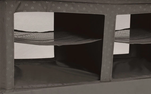 Der faltbare Campingschrank Aruba in Grau mit 4 Staufächern und 2 Netzfächern eignet sich hervorragend, um Campingzubehör zu verstauen. Die robuste, herunterklappbare Tür mit Griff bietet einen geräuscharmen nutzbaren Stauraum wie zu Hause. Die Tür ist mit einem Magentverschluss ausgestattet. An der Seite befindet sich zusätzlich noch ein praktischer Organizer und ein Haken um Dinge aufzuhängen. Der Campingschrank kann alleine oder zusammen mit dem Neat´n´Tidy Organiser verwendet werden. Inklusive Tragetasche für einfache Lagerung und Transport.